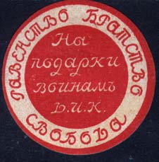 1917 г. Круг диаметром 37 мм. Одноцветная печать на желтоватой бумаге. В центре на фоне круга диа-метром 25 мм текст в четыре строки: «На подарки воинам. Д.И.К.». По окружности текст: «Свобода, равенство, братство».
