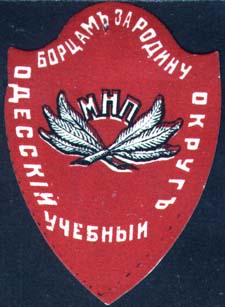 1915(?) г. Виньетка в виде фигурного щитка сложной формы разм. 36 х 51 мм. Двухцветная печать на тол-стой белой бумаге. В центре две скрещенные лавровые ветви и аббревиатура «МНП». По периметру текст: «Борцам за Родину Одесский учебный округ».