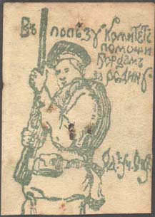 1915(?) г. Разм. 36 х 51 мм. Одноцветная печать на желтоватой бумаге. В центре солдат с винтовкой в руках. Сверху справа текст в четыре строки: «В пользу комитета помощи борцам за Родину». Внизу справа текст: «Од[есская]. Уч[ительская]. Орг[анизация].»