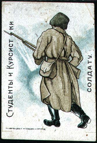 1915(?) г. Разм. 55 х 80 мм. Многоцветная печать на сероватой бумаге с мелованным верхним слоем. В центре солдат в зимнем обмундировании, идущий с винтовкой наперевес на фоне разрыва снаряда. Слева и справа текст вертикально снизу вверх: «Студенты и курсистки солдату». Внизу слева мелким шрифтом …