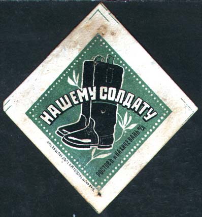 1915(?) г. Ромб разм. Разм. 67 х 70 мм. Двухцветная печать на сероватой бумаге с мелованным верхним слоем. В центре в ромбовидной рамке пара солдатских сапог. Полукругом текст: «Нашему солдату». Справа внизу вдоль рамки текст: «Ростов-Нахичевань Н/Д». Внизу слева под рамкой мелким шрифтом выходны…