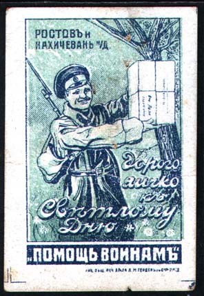 1915(?) г. Разм. рамки ≈ 38 х 55 мм. Двухцветная печать на толстой желтоватой бумаге с мелованным верхним слоем. В центре солдат держит в руках посылку с пасхальными подарками. Слева сверху текст в две строки: «Ростов и Нахичевань н/Д.». Слева внизу текст в пять строк: «Дорого яичко к Светлому Дн…