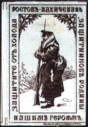 1915(?) г. Разм. рамки 43 х 67 мм. Одноцветная печать на сероватой бумаге с мелованным верхним слоем. В двойной рамке в центре часовой на посту в зимнем обмундировании. По периметру между рамками текст: «Ростов-Нахичевань нашим героям. Защитите от холода защитников Родины». Внизу справа под рамко…