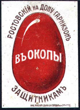 1916 г. Разм. 43 х 62 мм. Двухцветная печать на серо-ватой бумаге с мелованным верхним слоем. В центре пасхальное яйцо, на котором текст: «В окопы». Сверху полукругом текст: «Ростовский-на-Дону гарнизон». Внизу полукругом текст: «Защитникам». Внизу мелким шрифтом выходные данные: «Акц. Общ. Печ. …