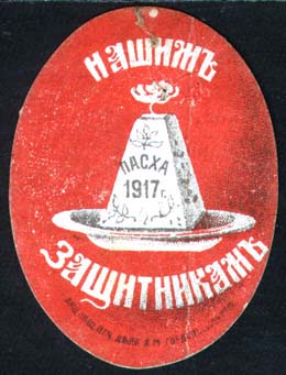 1917 г. 14.03.1917 г. Овал разм. ≈ 41 х 56 мм. Двухцветная печать толстой желтоватой бумаге с мелованным верхним слоем. В центре на тарелке пасхальный кулич с текстом в две строки: «Пасха 1917 г.». Текст: «Нашим защитникам». Внизу полукругом выходные данные мелким шрифтом: «Акц. Общ. Печ. дела А.М…