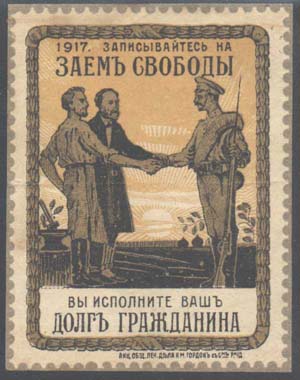 1917 г. Разм. рамки 41 х 55 мм. Многоцветная печать на белой бумаге. В центре в декоративной рамке рабочий и крестьянин пожимают руку солдату на фоне восходящего солнца. Слева молот и наковальня. На заднем плане поле и купола церкви. Сверху текст в две строки: «1917. Записывайтесь на Заем Свободы…