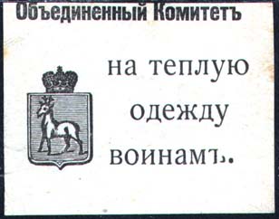 1915(?) г. Разм. 50 х 40 мм. Одноцветная печать на белой бумаге. Сверху текст: «Объединенный Комитет». Ниже справа герб Ростова, слева текст в три строки: «На теплую одежду воинам».