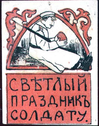 1917 г. 18.03.1917 г. Разм. 52 х 68 мм. Двухцветная печать на белой бумаге. Сверху в декоративной рамке сидящий солдат с винтовкой и с пасхальным куличом в руках. Внизу в прямоугольной рамке текст в три строки: «Светлый праздник солдату».