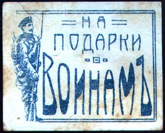 1916 г. 20.12.1916 г. 1916 г. (20.12.1916 г.) Разм. рис. 49 х 38 мм. Одноцветная печать на белой бумаге. В двойной прямоугольной рамке слева солдат с винтовкой. Справа текст в три строки: «На подарки воинам».