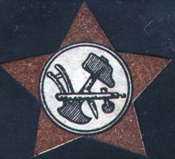 1919(?) г. Разм. 43 х 39 мм. Двухцветная печать на белой бумаге. Виньетка в виде пятиконечной звезды с плугом и молотом в центре.
