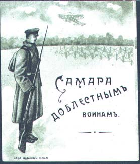 1915 г. 20.-21.11.1915 г. Разм. 45 х 56 мм. Двухцветная печать на белой бумаге. На переднем плане солдат с винтовкой. На заднем плане проволочные заграждения. В небе летящий самолет. В центре справа текст в три строки: «Самара доблестным воинам». Слева внизу выходные данные мелким шрифтом: «Пт. Б…