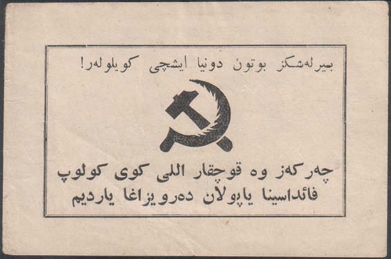 1928(?) г. Разм. 94 х 62 мм. Одноцветная печать на белой бумаге. В двойной прямоугольной рамке разм. 74 х 42 мм в центре серп и молот. Сверху текст на узбекском языке арабским шрифтом. Внизу текст в две строки на узбекском языке арабским шрифтом.