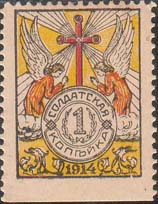 1916 г. Разм. рамки 21 х 28 мм. Трехцветная печать на плотной сероватой бумаге. Зубц. 11 1/2. С клеем. Эмблема общества и различные аллегорические сюжеты.