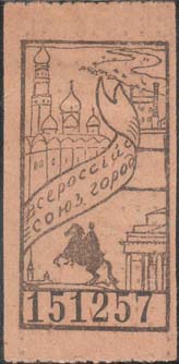 1916 г. Разм. рамки 22 х 44 мм. Одноцветная печать на желтоватой бумаге. Горизонтальная просечка. В рамке Московский Кремль и Памятник Петру I в Санкт-Петербурге и лента с текстом: «Всероссийский Союз городов». Внизу в отдельной рамке номер, отпечатанный нумератором.