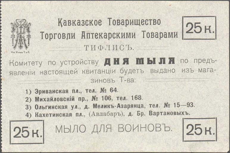 1915 г. Квитанция разм. 130 х 88 мм. Одноцветная печать на бумаге различных цветов. Левосторонняя зубц. 11 1/2. В левом верхнем углу вензель из букв: «К.Т.Т.А.Т.», в остальных углах номинал в рамках. В центре текст в одиннадцать строк: «Кавказское Товарищество Торговли Аптекарскими Товарами в Тиф…