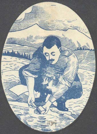 1915 г. Разм. 63 х 82 мм. Одноцветная печать на бумаге различных цветов. Солдат моет руки мылом в реке на фоне гор. Слева внизу мелким шрифтом выходные данные: «Лит. С.М. Быхова».