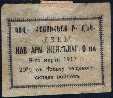 1917 г. 09.03.1917 г. Разм. рамки 54 х 41 мм. Одноцветная печать на тонкой желто-серой бумаге. В декоративной прямоугольной рамке сверху текст на армянском языке. В центре текст в две строки: ««День» Кав[казского]. Арм[янского]. Жен[ского]. Благо[отворительного]. О-ва». Ниже тест в три строки: «9…