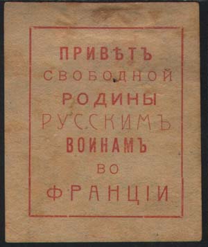 1917 г. 19.05.1917 г. 1917 г. (19.05.1917 г.). Разм. рамки 37 х 46 мм. Одноцветная печать на тонкой светло-желтой бумаге. В прямоугольной рамке текст в семь строк: «Привет свободной Родины русским воинам во Франции».