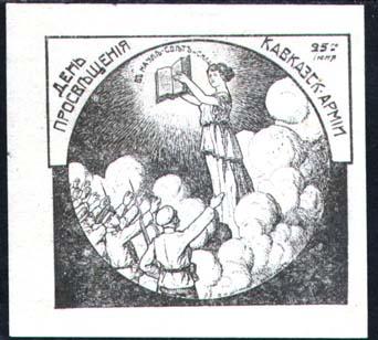 1917 г. 25.06.1917 г. Разм. 49 х 63 мм. Одноцветная печать на светло-желтой бумаге. В прямоугольной рамке из ромбиков в центре текст в пять строк: «День просвещения Кавказской армии 25 июня 1917 г». Сверху и снизу растительный орнамент.