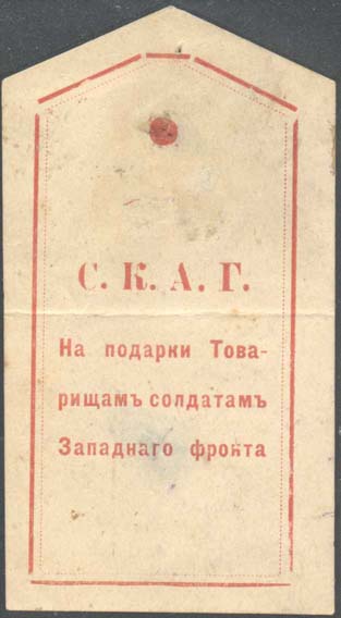 1917 г. Виньетка в виде погона разм. 51 х 94 мм. Одноцветная печать на желтоватой бумаге. В рамке в форме погона сверху пуговица. В центре текст в четыре строки: «С.К.А.Г. На подарки Товарищам солдатам Западного фронта».