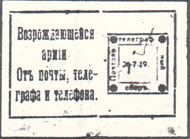 1919 г. 26.07.1919 Одноцветная двухсторонняя печать на желтоватой бумаге. На лицевой стороне в прямоугольной рамке разм. 49 х 32 мм слева текст в четыре строки: «Возрождающейся армии от почты, телеграфа и телефона». Справа в двойной прямоугольно рамке дата: «26.7.19». По периметру между рамками те…