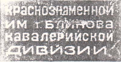1920(?) г. Разм. 64 х 32 мм. Двухцветная печать на белой бумаге. На сплошном черном фоне текст в четыре строки: «Краснознаменной им. т. Блинова кавалерийской дивизии».