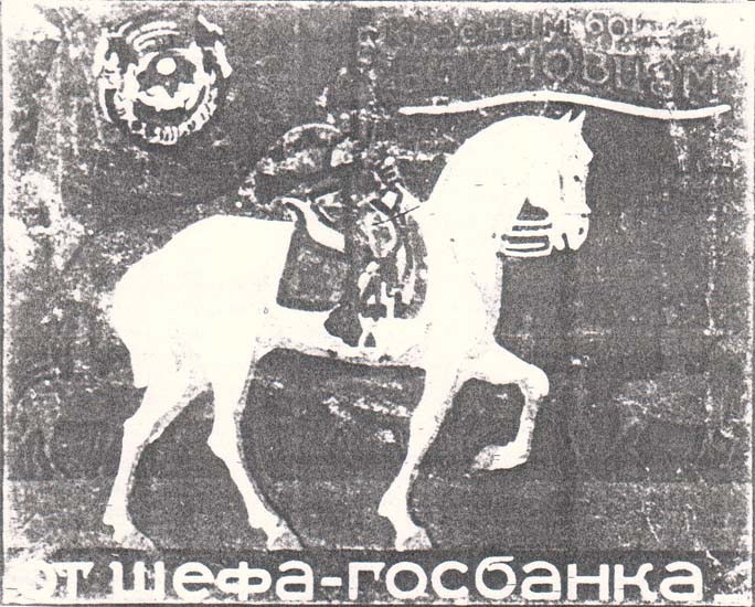 1920(?) г. Листок разм. 116 х 92 мм. Многоцветная печать на белой бумаге. В центре всадник на лошади со знаменем. На полотнище знамени орден Красного Знамени. На заднем плане всадники на лошадях. В правом верхнем углу текст в две строки: «Красным бойцам Блиновцам». Внизу продолжение текста: «От ш…