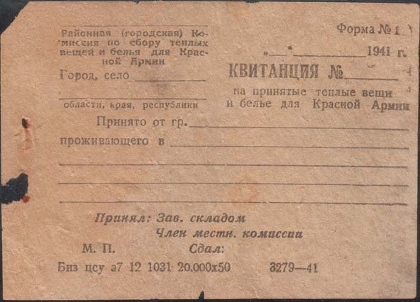 1941 г. Листок из квитанционной книжки разм. 99 х 70 мм. Лдноцве ная печать на желтоватой бумаге низкого качества. В цен ре текст в восемь строк: «Принято от гр[ажданина]. ... проживающего в ... Принял: Зав[едующий]. складом ... Член местн[ой]. комиссии ... М[есто].П[ечати]. Сдал: ...». В левом в…