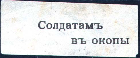 1915(?) г. Разм. 82 х 32 мм. Одноцветная печать на сероватой бумаге. В центре текст в две строки: «Солдатам в окопы».