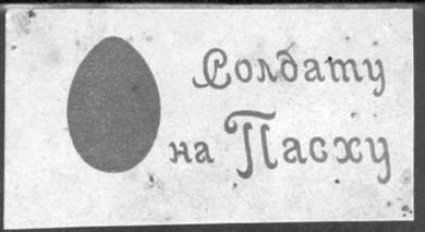 1915(?) г. Разм. 59 х 30 мм. Одноцветная печать на толстой желтоватой бумаге. Слева пасхальное яйцо, справа текст в две строки: «Солдату на Пасху».