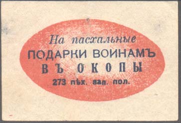1915(?) г. Разм. 60 х 40 мм. Двухцветная печать на тонкой кремовой бумаге. В центре горизонтально пасхальное яйцо, на котором текст в четыре строки: «На пасхальные подарки воинам в окопы 273 пех[отный]. зап[асной]. пол[к].».