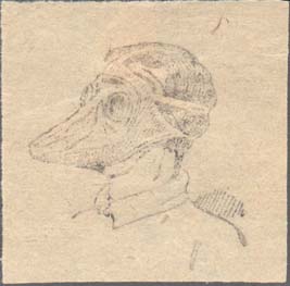 1915(?) г. Разм. 44 х 44 мм. Одноцветная печать на серо-желтой бумаге. В центре человек в противогазной маске.