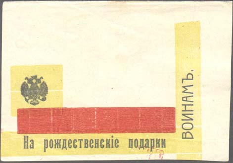 1915(?) г. Разм. 78 х 55 мм. Трехцветная печать на белой бумаге. Слева на сплошном фоне герб России. Внизу и слева вертикально текст: «На рождественские подарки воинам».