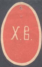 1915(?) г. Виньетка в форме яйца разм. 23 х 36 мм. Одноцветная печать на желтоватой бумаге. В центре яйцо, в центре которого буквы «Х» и «В».