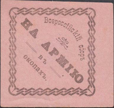 1915(?) г. Ромб разм. 88 х 88 мм. Одноцветная печать на серо-розоватой бумаге. В центре в декоративной рамке в форме ромба текст в четыре строки: «Всероссийский сбор на армию в окопах».