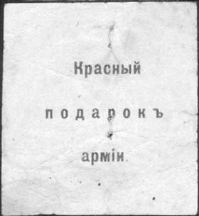 1917(?) г. 19.10.1917 г. Разм. 47 х 51 мм. Одноцветная печать на желтоватой бумаге. В центре текст в три строки: «Красный подарок армии».