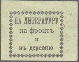 1917(?) г. Разм. 45 х 35 мм. Одноцветная печать на светло-зеленой бумаге. В центре в прямоугольной рамке из ромбиков разм. 32 х 27 мм текст в четыре строки: «На литературу на фронт и в деревню».