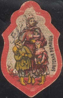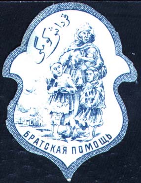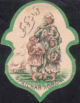 1916(?) г. Виньетка в виде фигурного щитка сложной формы разм. 36 х 55 мм. Трехцветная и многоцветная печать на белой бумаге. В центре группа беженцев на фоне горящей деревни. Справа текст: «Братская помощь». Слева сверху текст на азербайджанском языке арабским шрифтом.