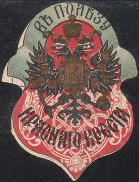 1915(?) г. Виньетка в виде фигурного щитка сложной формы разм. 46 х 60 мм. Многоцветная печать на белой бумаге. В центре на декоративном фоне герб России. Сверху полукругом текст: «В пользу». Внизу полукругом продолжение текста: «Красного Креста».