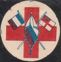 1915(?) г. Круг диаметром 42 мм. Двухцветная печать на белой бумаге. В центре на фоне красного креста скрещенные флаги России, Англии и Франции.