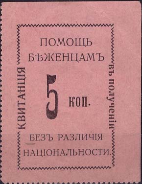 1915(?) г. Разм. рамки 34 х 50 мм. Одноцветная печать на бумаге различных цветов. Зубц. 11 1/2. В прямоугольной декоративной рамке в центре номинал. По внутреннему периметру рамки текст: «Квитанция в получении. Помощь беженцам без различия национальности». На оборотной сторон фиолетовый оттиск кр…