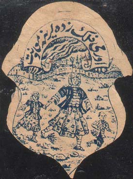 1917 г. 20.08.1917 г. Виньетка в виде фигурного щитка сложной формы разм. 44 х 62 мм. Одноцветная печать на тонкой сероватой бумаге. В фигурной рамке женщина с двумя детьми на фоне горящего города. Сверху полукругом на ленте текст на азербайджанском языке арабским шрифтом.
