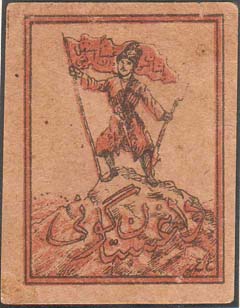 1917(?) г. Разм. 39 х 51 мм. Двухцветная печать на желто-коричневой бумаге низкого качества. В двойной прямоугольной рамке разм. 34 х 45 мм в центре солдат в национальной одежде с винтовкой и красным знаменем на вершине горы. На полотнище знамени текст на азербайджанском языке арабским шрифтом. В…
