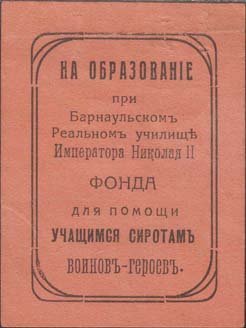 1915(?) г. Разм. 41 х 55 мм. Одноцветная печать на оранжево-серой бумаге. В двойной прямоугольной декоративной рамке разм. 31 х 45 мм с закругленными углами в центре текст в девять строк: «На образование при Барнаульском Реальном училище Императора Николая II фонда для помощи учащимся сиротам вои…