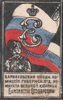 1915(?) г. Разм. рамки 35 х 56 мм. Двухцветная печать на белой бумаге. Сверху в прямоугольной рамке солдат с флагом с вензелем в виде буквы «Е». Внизу в прямоугольной рамке текст в четыре строки: «Барнаульская уездн[ая]. Комиссия губернск[ого]. Отд[ела]. Комитета Великой Княгини Елизаветы Федоров…