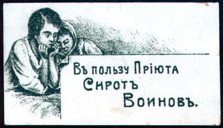 1917 г. 01.07.1917 г. Разм. 75 х 43 мм. Одноцветная печать на белой бумаге. Слева двое детей. Справа внизу текст в три строки: «В пользу Приюта Сирот Воинов».
