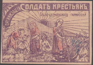 1917 г. 19.11.1917 г. Разм. рамки 58 х 39 мм. Одноцветная печать на кремовой бумаге. В центре на фоне горы, из-за которой восходит солнце, три крестьянки в поле. Сверху текст в две строки: «Организация солдат крестьян Бело-церковского гарнизона».
