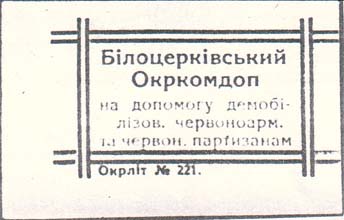 1924(?) г. Разм. 57 х 36 мм. Одноцветная печать на плотной серой бумаге. В двойной прямоугольной рамке разм. 40 х 22 мм в центре текст в пять строк на украинском языке: Белоцерковский Окркомпом на помощь демобилизов[аным]. Красноарм[ейцам]. и красн[ым]. партизанам». Внизу мелким шрифтом выходные …