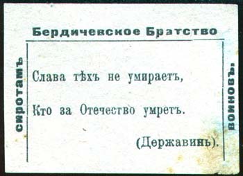 1915(?) г. Разм. 57 Х 42 мм. Одноцветная печать на сероватой бумаге. В центре в трехсторонней прямоугольной рамке разм. 47 х 30 мм текст в три строки: «Слава тех не умирает, кто за Отечество умрет. (Державин)». По наружному периметру рамки текст: «Бердичевское Братство сиротам воинов».
