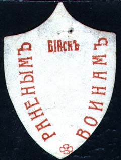 1916 г. Июнь 1916 г. Виньетка в виде фигурного щитка сложной формы разм. 38 х 53 мм. Одноцветная печать на белой бумаге. По периметру щитка текст: «Бийск раненым воинам». Внизу декоративный элемент.